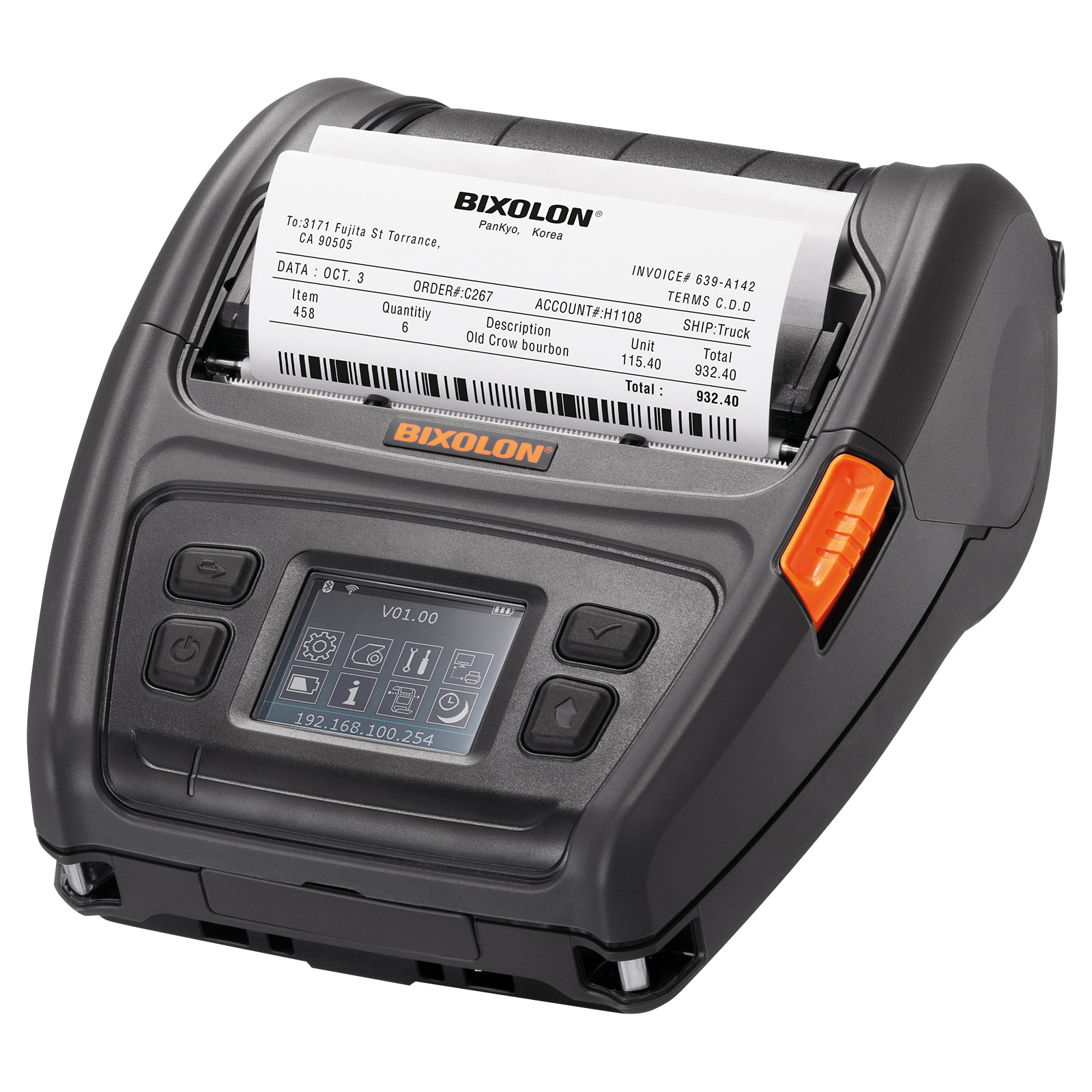 Etikettendrucker, Mobildrucker, Thermodirekt, Auflösung: 8 Punkte/mm (203 dpi), Medienbreite (max): 112 mm, Druckbreite (max.): 104 mm, Rollendurchmesser (max.): 66mm, Geschwindigkeit (max.): 127 mm/Sek, LCD Display, Black Mark Sensor, Gap Sensor, RFID, USB, RS232, Bluetooth (iOS), WLAN (802.11a/b/g/n), RAM: 128MB, Flash: 256 MB, Emulation: ZPLII, BXL/POS, SLCS, CPCL, inkl.: Netzteil, Netzkabel, Gürtelschlaufe, Akku, 6800 mAh