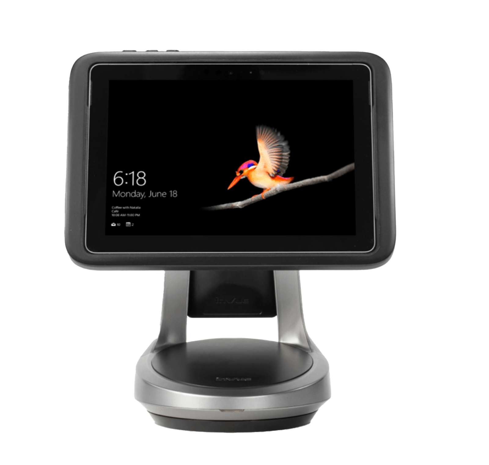 Der NE360C ist ein freistehender Tablet-Ständer, der sich wahlweise durch Kleben oder Schrauben an einer Arbeitsplatte befestigen lässt. Die Basis bleibt dabei um 270° drehbar und das Tablet lässt sich zwischen 30° bis 75° neigen. Die integrierte Ladestation lädt das angedockte Tablet sowie angeschlossene Scanner, Zahlungsterminals oder andere Peripheriegeräte auf, so dass diese jederzeit einsatzbereit sind – auch für den mobilen Einsatz.